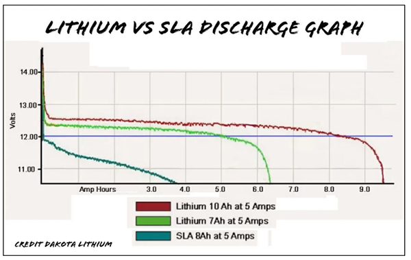 - Baterai asam timbal bersegel kecil mengalami penurunan tegangan yang ekstrim di bawah beban berat. Mereka tidak pernah dirancang untuk aplikasi ampere tinggi. Faktanya, baterai asam timbal bersegel kecil dirancang untuk memiliki beban kecil dalam jangka waktu yang lama. Menerapkan 15 hingga 20 amp khas dari radio 100 watt modern, kami mengalami penurunan tegangan yang signifikan. Baterai lithium ion atau lithium iron phosphate yang dibuat dengan benar tidak menunjukkan penurunan voltase yang sama seperti baterai asam timbal. Sebenarnya di bawah beban, tegangan relatif datar saat menggunakan paket lithium ion dan lithium iron phosphate.