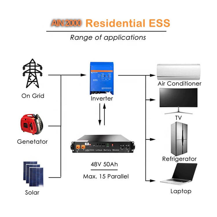 1. Baterai sistem tata suryaAIN2000 48v dikembangkan dengan sel LFP berkinerja tinggi 3.2V 50Ah dan struktur standar EV untuk menjamin keamanan dan masa pakai yang luar biasa.